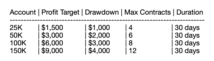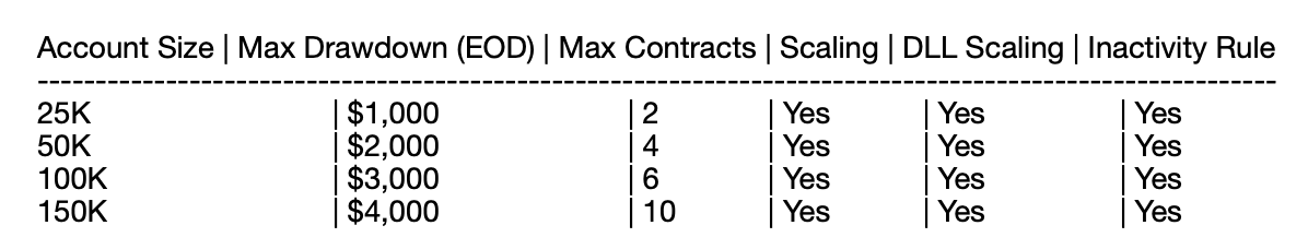Account | Max Drawdown | Max Contracts | Scaling | DLL